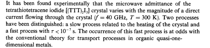 It has been found experimentally that the microwave admittance of the tetrathiotetracene iodide [(TTT)2I3] crystal varies with the magnitude of a direct current flowing through the crystal if = 40 GHz, Τ = 300 К). Two processes have been distinguished: a slow process related to the heating of the crystal and a fast process with τ < 10~7 s. The occurrence of this fast process is at odds with the conventional theory for transport processes in organic quasi-one-dimensional metals.