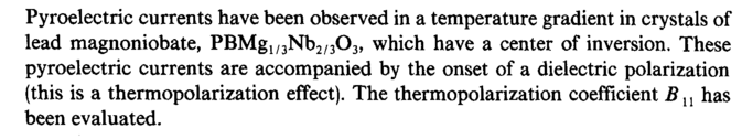 Pyroelectric currents have been observed in a temperature gradient in crystals of lead magnoniobate, PBMg1/3Nb2/303, which have a center of inversion. These pyroelectric currents are accompanied by the onset of a dielectric polarization (this is a thermopolarization effect). The thermopolarization coefficient Bn has been evaluated.