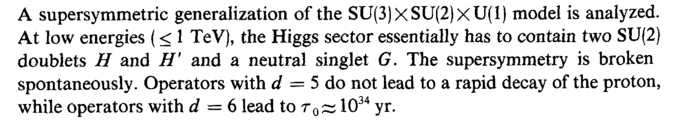 A supersymmetric generalization of the SU(3)XSU(2)XU(1) model is analyzed. At low energies (< 1 TeV), the Higgs sector essentially has to contain two SU(2) doublets Η and Л' and a neutral singlet G. The supersymmetry is broken spontaneously. Operators with d — 5 do not lead to a rapid decay of the proton, while operators with d = 6 lead to τ0~ 1034 yr.