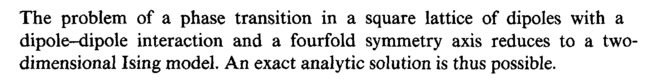 The problem of a phase transition in a square lattice of dipoles with a dipole-dipole interaction and a fourfold symmetry axis reduces to a two-dimensional Ising model. An exact analytic solution is thus possible.