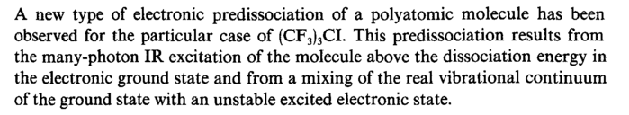 A new type of electronic predissociation of a polyatomic molecule has been observed for the particular case of (CF3)3CI. This predissociation results from the many-photon IR excitation of the molecule above the dissociation energy in the electronic ground state and from a mixing of the real vibrational continuum of the ground state with an unstable excited electronic state.