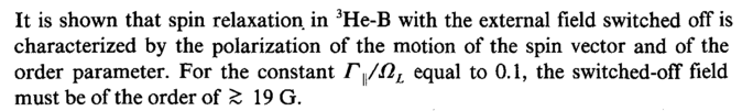 It is shown that spin relaxation in 3He-B with the external field switched off is characterized by the polarization of the motion of the spin vector and of the order parameter. For the constant r^/QL equal to 0.1, the switched-off field must be of the order of £ 19 G.