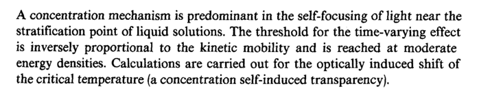 A concentration mechanism is predominant in the self-focusing of light near the stratification point of liquid solutions. The threshold for the time-varying effect is inversely proportional to the kinetic mobility and is reached at moderate energy densities. Calculations are carried out for the optically induced shift of the critical temperature (a concentration self-induced transparency).