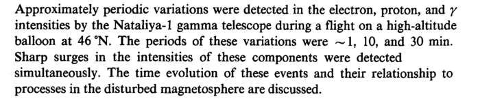Approximately periodic variations were detected in the electron, proton, and γ intensities by the Nataliya-1 gamma telescope during a flight on a high-altitude balloon at 46 °N. The periods of these variations were ~1, 10, and 30 min. Sharp surges in the intensities of these components were detected simultaneously. The time evolution of these events and their relationship to processes in the disturbed magnetosphere are discussed.