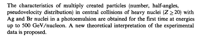 The characteristics of multiply created particles (number, half-angles, pseudovelocity distribution) in central collisions of heavy nuclei (Z > 20) with Ag and Br nuclei in a photoemulsion are obtained for the first time at energies up to 500 GeV/nucleon. A new theoretical interpretation of the experimental data is proposed.