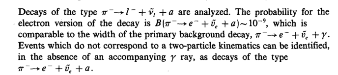 Decays of the type π ~-> /" -fv, + a are analyzed. The probability for the electron version of the decay is ÷(ÔÇ~-+Å~ +ve + α)~1(Γ9, which is comparable to the width of the primary background decay, 7ç"-> e~ +ve + γ. Events which do not correspond to a two-particle kinematics can be identified, in the absence of an accompanying γ ray, as decays of the type