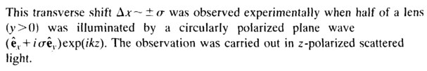 This transverse shift Αχ — ±σ was observed experimentally when half of a lens (y>0) was illuminated by a circularly polarized plane wave (er+ iaev)cxp(ikz). The observation was carried out in z-polarized scattered light.