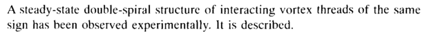 A steady-state double-spiral structure of interacting vortex threads of the same sign has been observed experimentally. It is described.