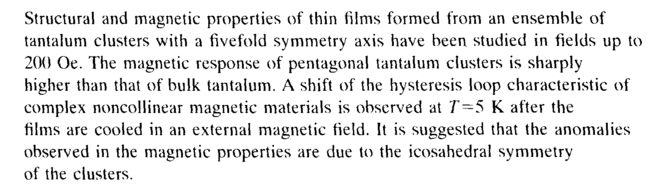 Structural and magnetic properties of thin films formed from an ensemble of tantalum clusters with a fivefold symmetry axis have been studied in fields up to 200 Oe. The magnetic response of pentagonal tantalum clusters is sharply higher than that of bulk tantalum. A shift of the hysteresis loop characteristic of complex noncollinear magnetic materials is observed at T=5 К after the films are cooled in an external magnetic field. It is suggested that the anomalies observed in the magnetic properties are due to the icosahedral symmetry of the clusters.