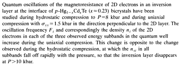 Quantum oscillations of the magnetoresistance of 2D electrons in an inversion layer at the interface of p-Hgi_,Cd^Te (x = 0.23) bicrystals have been studied during hydrostatic compression to P=8 kbar and during uniaxial compression with σνν= 1.5 kbar in the direction perpendicular to the 2D layer. The oscillation frequency F, and correspondingly the density я, of the 2D electrons in each of the three observed energy subbands in the quantum well increase during the uniaxial compression. This change is opposite to the change observed during the hydrostatic compression, at which the nsi in all subbands fall off rapidly with the pressure, so that the inversion layer disappears at P>10 kbar.