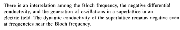 There is an interrelation among the Bloch frequency, the negative differential conductivity, and the generation of oscillations in a superlattice in an electric field. The dynamic conductivity of the superlattice remains negative even at frequencies near the Bloch frequency.