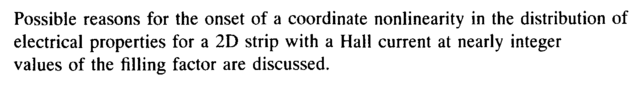 Possible reasons for the onset of a coordinate nonlinearity in the distribution of electrical properties for a 2D strip with a Hall current at nearly integer values of the filling factor are discussed.