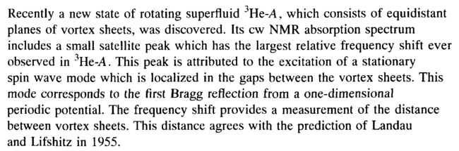 Recently a new state of rotating superfluid 3He-A, which consists of equidistant planes of vortex sheets, was discovered. Its cw NMR absorption spectrum includes a small satellite peak which has the largest relative frequency shift ever observed in 3He-A. This peak is attributed to the excitation of a stationary spin wave mode which is localized in the gaps between the vortex sheets. This mode corresponds to the first Bragg reflection from a one-dimensional periodic potential. The frequency shift provides a measurement of the distance between vortex sheets. This distance agrees with the prediction of Landau and Lifshitz in 1955.