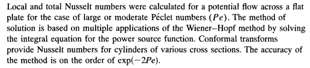 Local and total Nusselt numbers were calculated for a potential flow across a flat plate for the case of large or moderate Peclet numbers (Pe). The method of solution is based on multiple applications of the Wiener-Hopf method by solving the integral equation for the power source function. Conformal transforms provide Nusselt numbers for cylinders of various cross sections. The accuracy of the method is on the order of exp(—2Pe).