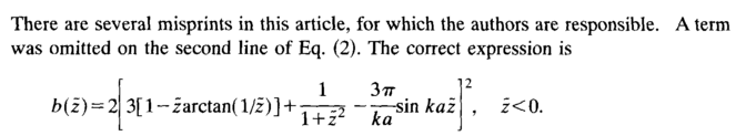 There are several misprints in this article, for which the authors are responsible. A term was omitted on the second line of Eq. (2). The correct expression is b(z) = 2 3[l-iarctan( !/£)] + 1 úÔÇ Ì , -2 7—sin kaz l + z ka z<0.