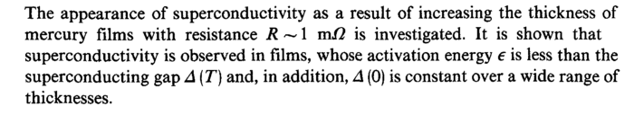 The appearance of superconductivity as a result of increasing the thickness of mercury films with resistance R ~ 1 τηΩ is investigated. It is shown that superconductivity is observed in films, whose activation energy e is less than the superconducting gap Δ (Τ) and, in addition, Δ (0) is constant over a wide range of thicknesses.