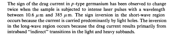 The sign of the drag current in ρ -type germanium has been observed to change twice when the sample is subjected to intense laser pulses with a wavelength between 10.6 μτη and 385 μτα. The sign inversion in the short-wave region occurs because the current is carried predominantly by light holes. The inversion in the long-wave region occurs because the drag current results primarily from intraband "indirect" transitions in the light and heavy subbands.