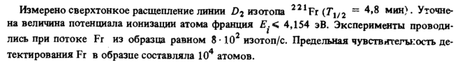 Измерено сверхтонкое расщепление линии D2 изотопа Fr (Г1/2 " 4'8 мин). Уточнена величина потенциала ионизации атома франция Е.< 4,154 эВ. Эксперименты проводились при потоке Fr из образца равном 8-10 изотоп/с. Предельная чувствятегы:ость детектирования Fr в образце составляла 104 атомов.