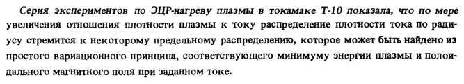 Серия экспериментов по ЭЦР-нагреву плазмы в токамаке ΤΊ0 показала, что по мере увеличения отношения плотности плазмы к току распределение плотности тока по радиусу стремится к некоторому предельному распределению, которое может быть найдено из простого вариационного принципа, соответствующего минимуму энергии плазмы и полои-дального магнитного поля при заданном токе.