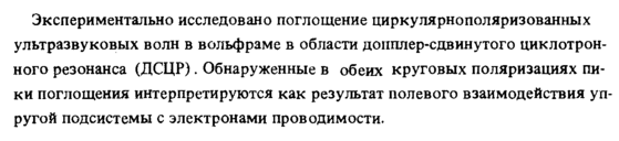 Экспериментально исследовано поглощение циркулярнополяризованных ультразвуковых волн в вольфраме в области допплер-сдвинутого циклотронного резонанса (ДСЦР) . Обнаруженные в обеих круговых поляризациях пики поглощения интерпретируются как результат полевого взаимодействия упругой подсистемы с электронами проводимости.