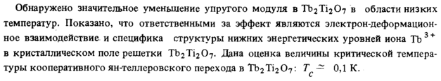 Обнаружено значительное уменьшение упругого модуля в Tb2Ti207 в области низких температур. Показано, что ответственными за эффект являются электрон-деформационное взаимодействиеи специфика структуры нижних энергетических уровней иона ТЪ 3 + в кристаллическом поле решетки Tb2Ti207. Дана оценка величины критической температуры кооперативного ян-теллеровского перехода в Tb2Ti207: Τ — ОД К.