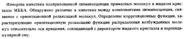 Измерена кинетика поляризованной люминесценции примесных молекул в жидком кристалле МБ Б А. Обнаружено различие в кинетике между компонентами люминесценции, связанное с ориентационной релаксацией молекул. Определены корреляционные функции, характеризующие ориентационную релаксацию функции распределения возбужденных молекул относительно оси вращения, совпадающей с директором жидкого кристалла и перпендикулярной ему.