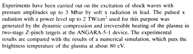 Experiments have been carried out on the excitation of shock waves with pressure amplitudes up to 3 Mbar by soft χ radiation in lead. The pulsed χ radiation with a power level up to 2 TW/cm2 used for this purpose was generated by the dynamic compression and irreversible heating of the plasma in two-stage Z-pinch targets at the ANGARA-5-1 device. The experimental results are compared with the results of a numerical simulation, which puts the brightness temperature of the plasma at about 80 eV.
