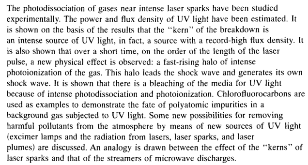 The photodissociation of gases near intense laser sparks have been studied experimentally. The power and flux density of UV light have been estimated. It is shown on the basis of the results that the "kern" of the breakdown is an intense source of UV light, in fact, a source with a record-high flux density. It is also shown that over a short time, on the order of the length of the laser pulse, a new physical effect is observed: a fast-rising halo of intense photoionization of the gas. This halo leads the shock wave and generates its own shock wave. It is shown that there is a bleaching of the media for UV light because of intense photodissociation and photoionization. Chlorofluorocarbons are used as examples to demonstrate the fate of polyatomic impurities in a background gas subjected to UV light. Some new possibilities for removing harmful pollutants from the atmosphere by means of new sources of UV light (excimer lamps and the radiation from lasers, laser sparks, and laser plumes) are discussed. An analogy is drawn between the effect of the "kerns" of laser sparks and that of the streamers of microwave discharges.