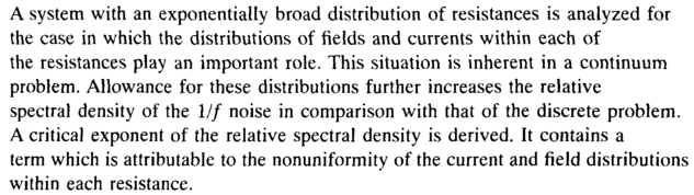 A system with an exponentially broad distribution of resistances is analyzed for the case in which the distributions of fields and currents within each of the resistances play an important role. This situation is inherent in a continuum problem. Allowance for these distributions further increases the relative spectral density of the 1// noise in comparison with that of the discrete problem. A critical exponent of the relative spectral density is derived. It contains a term which is attributable to the nonuniformity of the current and field distributions within each resistance.