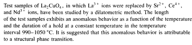 Test samples of La2Cu04, in which La3 + ions were replaced by Sr2 + , Ce4 + , and Nd3+ ions, have been studied by a dilatometric method. The length of the test samples exhibits an anomalous behavior as a function of the temperature and the duration of a hold at a constant temperature in the temperature interval 990-1050 °C. It is suggested that this anomalous behavior is attributable to a structural phase transition.