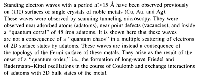 Standing electron waves with a period d>l5 A have been observed previously on (111) surfaces of single crystals of noble metals (Cu, Au, and Ag). These waves were observed by scanning tunneling microscopy. They were observed near adsorbed atoms (adatoms), near point defects (vacancies), and inside a "quantum corral" of 48 iron adatoms. It is shown here that these waves are not a consequence of a "quantum chaos" in a multiple scattering of electrons of 2D surface states by adatoms. These waves are instead a consequence of the topology of the Fermi surface of these metals. They arise as the result of the onset of a "quantum order," i.e., the formation of long-wave Friedel and Rudermann-Kittel oscillations in the course of Coulomb and exchange interactions of adatoms with 3D bulk states of the metal.
