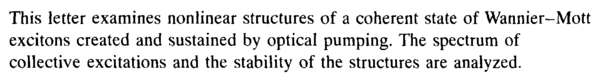 This letter examines nonlinear structures of a coherent state of Wannier-Mott excitons created and sustained by optical pumping. The spectrum of collective excitations and the stability of the structures are analyzed.