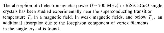 The absorption of rf electromagnetic power (f 700 MHz) in BiSrCaCuO single crystals has been studied experimentally near the superconducting transition temperature Tt. in a magnetic field. In weak magnetic fields, and below Tc, an additional absorption due to the Josephson component of vortex filaments in the single crystal is found.