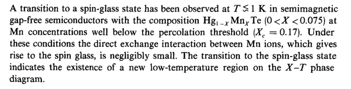 A transition to a spin-glass state has been observed at Τ S 1 К in semimagnetic gap-free semiconductors with the composition Hg[_xM%Te (0 <X <0.075) at Mn concentrations well below the percolation threshold (Xc =0.17). Under these conditions the direct exchange interaction between Mn ions, which gives rise to the spin glass, is negligibly small. The transition to the spin-glass state indicates the existence of a new low-temperature region on the X-T phase diagram.