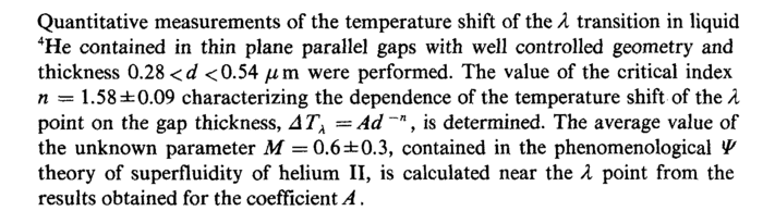 Quantitative measurements of the temperature shift of the λ transition in liquid 4He contained in thin plane parallel gaps with well controlled geometry and thickness 0.28 <d <0.54//m were performed. The value of the critical index η = 1.58 ±0.09 characterizing the dependence of the temperature shift of the Я point on the gap thickness, ΔΤλ =Ad~nf is determined. The average value of the unknown parameter Μ =0.6±0.3, contained in the phenomenological Ψ theory of superfluidity of helium II, is calculated near the Я point from the results obtained for the coefficient A.