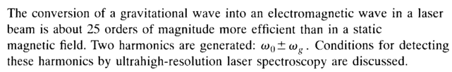 The conversion of a gravitational wave into an electromagnetic wave in a laser beam is about 25 orders of magnitude more efficient than in a static magnetic field. Two harmonics are generated: ω0±ω4,. Conditions for detecting these harmonics by ultrahigh-resolution laser spectroscopy are discussed.