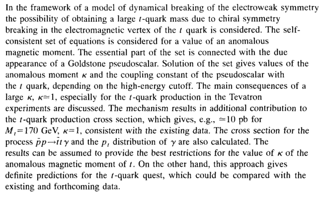 In the framework of a model of dynamical breaking of the electroweak symmetry the possibility of obtaining a large /-quark mass due to chiral symmetry breaking in the electromagnetic vertex of the t quark is considered. The self-consistent set of equations is considered for a value of an anomalous magnetic moment. The essential part of the set is connected with the due appearance of a Goldstone pseudoscalar. Solution of the set gives values of the anomalous moment Ë and the coupling constant of the pseudoscalar with the / quark, depending on the high-energy cutoff. The main consequences of a large Ë, Ë-1, especially for the /-quark production in the Tevatron experiments are discussed. The mechanism results in additional contribution to the /-quark production cross section, which gives, e.g., —10 pb for M, = 170 GeV, Ë=1, consistent with the existing data. The cross section for the process pp-Mty and the p, distribution of Õ are also calculated. The results can be assumed to provide the best restrictions for the value of Ë of the anomalous magnetic moment of /. On the other hand, this approach gives definite predictions for the /-quark quest, which could be compared with the existing and forthcoming data.