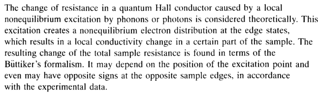 The change of resistance in a quantum Hall conductor caused by a local nonequilibrium excitation by phonons or photons is considered theoretically. This excitation creates a nonequilibrium electron distribution at the edge states, which results in a local conductivity change in a certain part of the sample. The resulting change of the total sample resistance is found in terms of the Biittiker's formalism. It may depend on the position of the excitation point and even may have opposite signs at the opposite sample edges, in accordance with the experimental data.