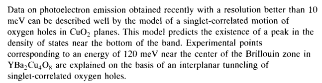 Data on photoelectron emission obtained recently with a resolution better than 10 meV can be described well by the model of a singlet-correlated motion of oxygen holes in Cu02 planes. This model predicts the existence of a peak in the density of states near the bottom of the band. Experimental points corresponding to an energy of 120 meV near the center of the Brillouin zone in YBa2Cu408 are explained on the basis of an interplanar tunneling of singlet-correlated oxygen holes.