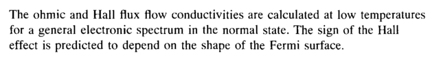 The ohmic and Hall flux flow conductivities are calculated at low temperatures for a general electronic spectrum in the normal state. The sign of the Hall effect is predicted to depend on the shape of the Fermi surface.