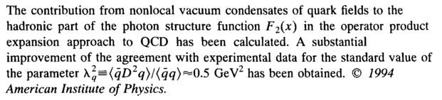 The contribution from nonlocal vacuum condensates of quark fields to the hadronic part of the photon structure function F2(x) in the operator product expansion approach to QCD has been calculated. A substantial improvement of the agreement with experimental data for the standard value of the parameter \2q={qD2q)/(qq) ^0.5 GeV2 has been obtained. © 1994 American Institute of Physics.