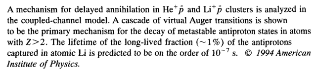 A mechanism for delayed annihilation in He+p and Li+p clusters is analyzed in the coupled-channel model. A cascade of virtual Auger transitions is shown to be the primary mechanism for the decay of metastable antiproton states in atoms with Z>2. The lifetime of the long-lived fraction (—1%) of the antiprotons captured in atomic Li is predicted to be on the order of 10~7 s. © 1994 American Institute of Physics.