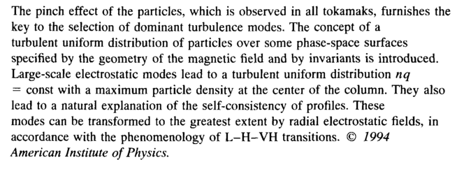 The pinch effect of the particles, which is observed in all tokamaks, furnishes the key to the selection of dominant turbulence modes. The concept of a turbulent uniform distribution of particles over some phase-space surfaces specified by the geometry of the magnetic field and by invariants is introduced. Large-scale electrostatic modes lead to a turbulent uniform distribution nq = const with a maximum particle density at the center of the column. They also lead to a natural explanation of the self-consistency of profiles. These modes can be transformed to the greatest extent by radial electrostatic fields, in accordance with the phenomenology of L-H-VH transitions. © 1994 American Institute of Physics.