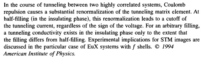 In the course of tunneling between two highly correlated systems, Coulomb repulsion causes a substantial renormalization of the tunneling matrix element. At half-filling (in the insulating phase), this renormalization leads to a cutoff of the tunneling current, regardless of the sign of the voltage. For an arbitrary filling, a tunneling conductivity exists in the insulating phase only to the extent that the filling differs from half-filling. Experimental implications for STM images are discussed in the particular case of EuX systems with / shells. © 1994 American institute of Physics.