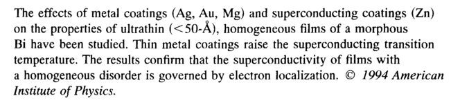 The effects of metal coatings (Ag, Au, Mg) and superconducting coatings (Zn) on the properties of ultrathin (<50-A), homogeneous films of a morphous Bi have been studied. Thin metal coatings raise the superconducting transition temperature. The results confirm that the superconductivity of films with a homogeneous disorder is governed by electron localization. © 1994 American Institute of Physics.