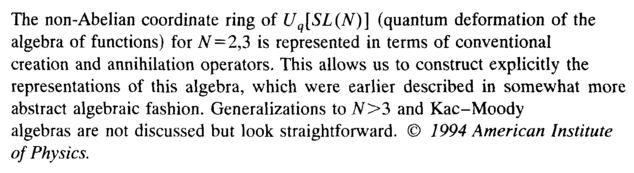 The non-Abelian coordinate ring of Uq[SL(N)] (quantum deformation of the algebra of functions) for N = 2,3 is represented in terms of conventional creation and annihilation operators. This allows us to construct explicitly the representations of this algebra, which were earlier described in somewhat more abstract algebraic fashion. Generalizations to JV>3 and Kac-Moody algebras are not discussed but look straightforward. © 1994 American Institute of Physics.
