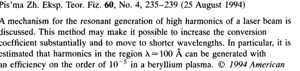 Pis'ma Zh. Eksp. Teor. Fiz. 60, No. 4, 235-239 (25 August 1994) A. mechanism for the resonant generation of high harmonics of a laser beam is discussed. This method may make it possible to increase the conversion coefficient substantially and to move to shorter wavelengths. In particular, it is sstimated that harmonics in the region λ = 100 A can be generated with in efficiency on the order of 10^5 in a beryllium plasma. © 1994 American