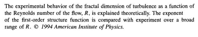 The experimental behavior of the fractal dimension of turbulence as a function of the Reynolds number of the flow, R, is explained theoretically. The exponent of the first-order structure function is compared with experiment over a broad range of R. © 1994 American Institute of Physics.