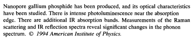 Nanopore gallium phosphide has been produced, and its optical characteristics have been studied. There is intense photoluminescence near the absorption edge. There are additional IR absorption bands. Measurements of the Raman scattering and IR reflection spectra reveal significant changes in the phonon spectrum. © 1994 American Institute of Physics.