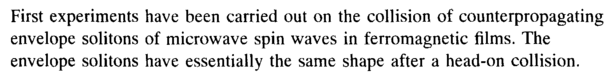 First experiments have been carried out on the collision of counterpropagating envelope solitons of microwave spin waves in ferromagnetic films. The envelope solitons have essentially the same shape after a head-on collision.